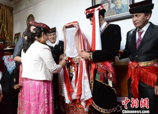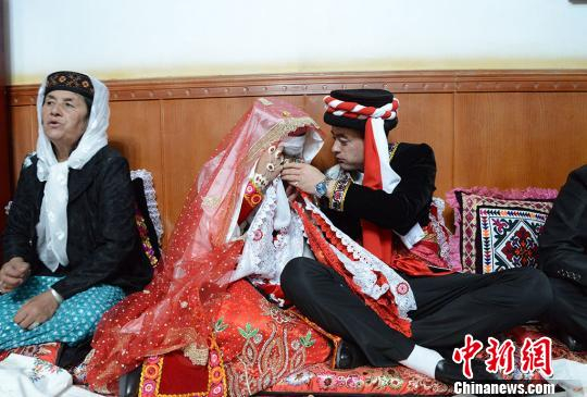 新郎新娘在婚礼仪式上交换系着红白两色手绢的戒指。 勉征 摄