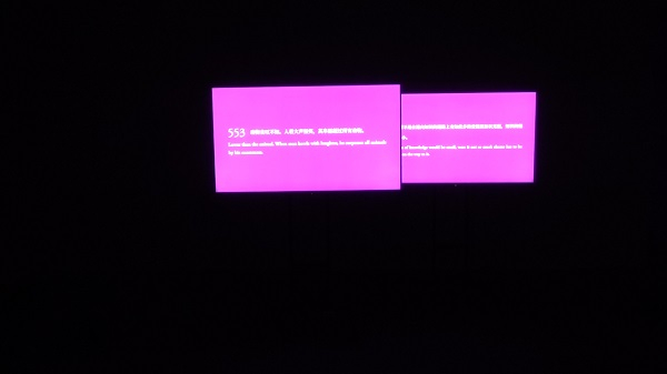 在展厅中,影像的载体有液晶屏幕、小电视机、投影和织布等组成,而展示屏幕上原有的尼采语录也将逐渐与现场拍摄完成的影片交织或同屏出现。杨福东告诉“澎湃新闻·艺术评论”,这些不同载体的屏幕在展厅中形成了互动;为了将语录内容和视觉相呼应,屏幕上的背景色和字体颜色也是精心挑选。
