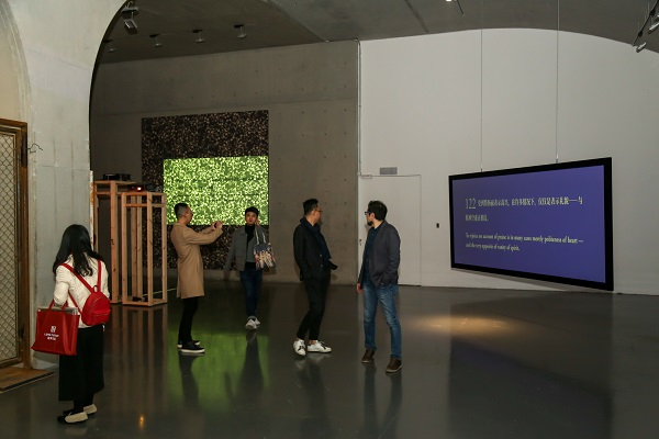 从作品本身的感觉来说,我们是在营造“明日早朝”在宋朝的一个情境。同时将每天拍摄的东西,及时放到屏幕上去呈现,然后做了一些视觉方面,包括文字、影像、壁纸的组合,构成一个空间中多屏幕的呈现。我觉得这是一种互动式的,引发人与人之间的思考。观众看的时候会有他自己的判断。这也是一个开放式的标准。