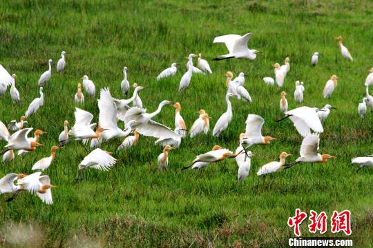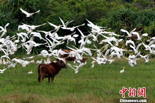 中新网北海5月4日电(陈燕 梁子明)近日,位于广西北海市涠洲岛牛角坑村、盛唐村的田间地头、北港防护林等不少地方,大量的鹭鸟、家燕等候鸟停歇于此觅食,场面甚为壮观。