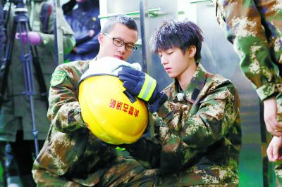 王俊凯(右)在《高能少年团2》第一期中体验消防兵生活。