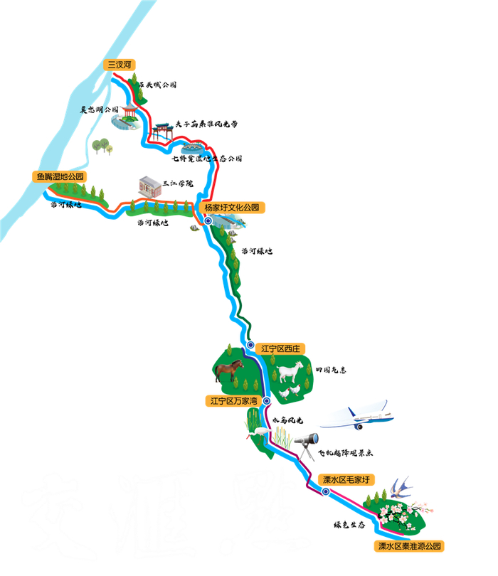 根据跑友提供的成果,活动主办方对这些内容进行了汇总整理和仔细梳理,并首次绘制出了“百里秦淮河全程行走线路图”,线路图标注了沿岸具体的徒步行走路线,以及沿途的最佳观赏亮点。