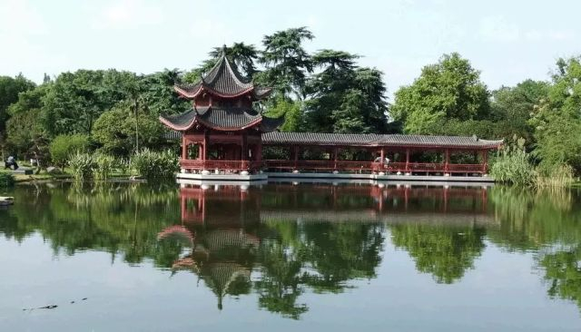 池塘中倒映着亭台楼阁的影子