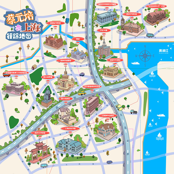 一份《蔡元培在上海行踪》手绘地图生动描绘了蔡元培在上海的15个重要生活、工作旧址