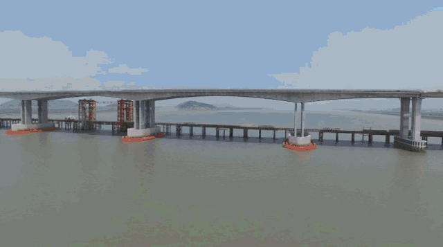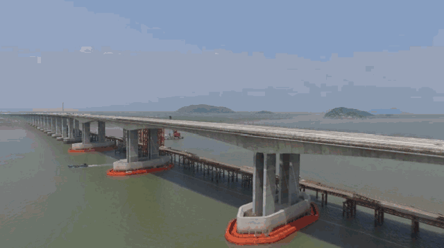 “我们采用的是国内领先的梁上架梁方法,就是将一孔箱梁架在桥墩上,然后通过设备从架好的箱梁上运送预制箱梁,在海中间进行架设。”市高指工程处处长张希介绍,全桥222幅箱梁目前已架设了170余幅,海上架梁工作将在6月上旬完工。