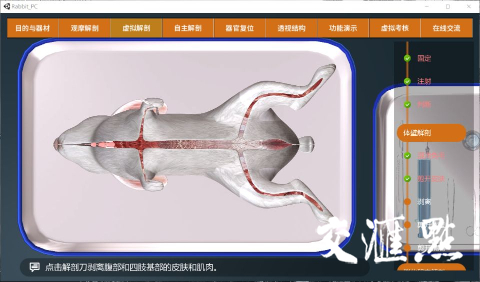 这不仅减少了解剖对实验材料的需求,而且使每一个学生都能轻松掌握解剖技巧以及兔形态结构相关知识。这是通过模拟解剖全过程所有操作,逐步认识兔体内各大器官实现的。虚拟考核这一步也能帮助教师更好的了解学生具体情况,针对性讲解,使教学更加高效。《兔》更给予了师生一个交流的平台,有问题共同讨论,以达到研究性教学的目的。