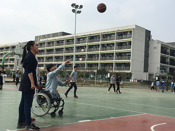 今年3月,郑海洋回到北川中学和高中校友一起打篮球。