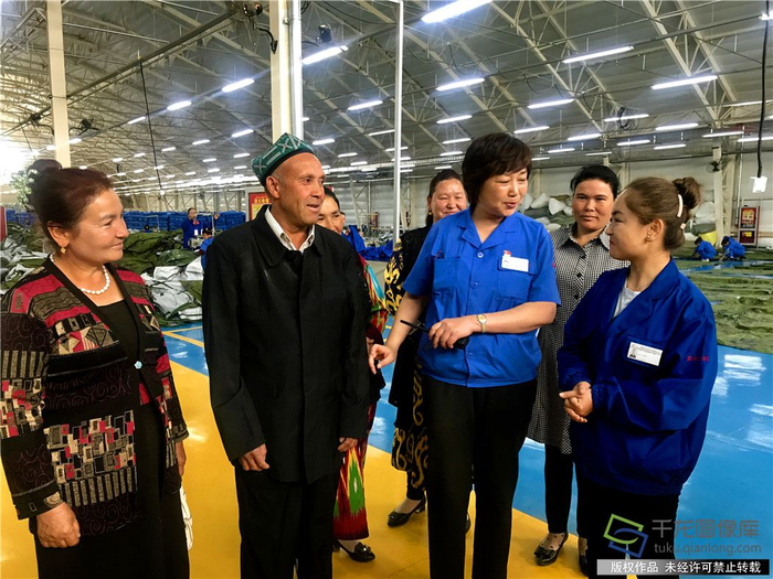 奴尔尼沙汗·亚森(右1)正在为来新疆京和纺织科技有限公司参观的维吾尔族职工家属当翻译。通讯员长征摄 千龙网发