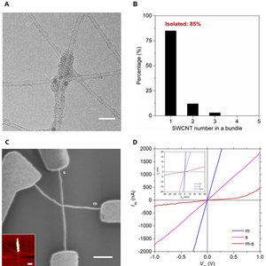 图1. 单根分散、具有碳焊结构的SWCNT网络。(A)典型TEM照片;(B)单根SWCNT的百分含量统计;(C-D)无碳焊结构的金属性-半导体性SWCNT的I-V传输特性;(E-F)有碳焊结构的金属性-半导体性SWCNT的I-V传输特性。