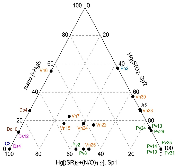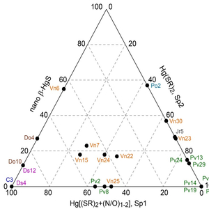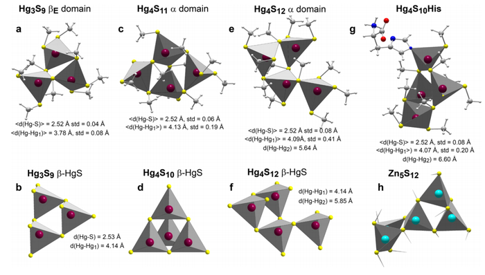 研究结果发现,在植物叶片中大部分汞以Hg[(SR)2+N/O0-2]的化学形态存在,部分汞以纳米颗粒态汞(HgxSy)的形态存在(图1)。通过二阶Møller-Plesset振动理论,利用计算机模拟了HgxSy的几何结构(图2)。本结果首次揭示了植物叶片可以将单质汞转化为惰性的纳米状硫化汞,这对深入了解叶片中汞的再挥发、毒性以及其进入土壤后的转化提供了基础理论知识,丰富了汞的生物地球循环理论。成果发表于环境科学领域期刊Environ. Sci. Technol。