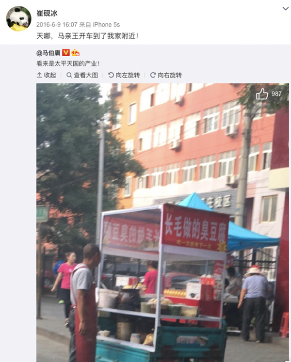 2016年某一天,马伯庸的微博上发了一张臭豆腐摊的照片。他被“长毛做的臭豆腐”招牌吸引了。我一眼就看出,这里是管庄路。