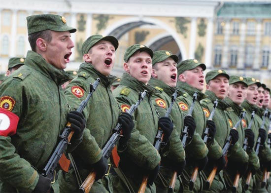 今年4月,俄罗斯军人在圣彼得堡接受检阅。
