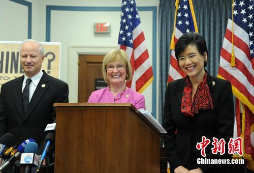 2011年美国国会参众两院要求国会正式承认《排华法案》有悖人权,并为此道歉。华裔众议员赵美心(右)在提交议案前召开记者会。(中新社记者 吴庆才 摄)