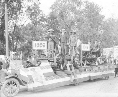 1919年5月10日,8位铺设最后一根铁轨的华工中的3名幸存者,被邀请出席美国跨州铁路合龙50周年纪念庆典。(加州铁路博物馆提供)
