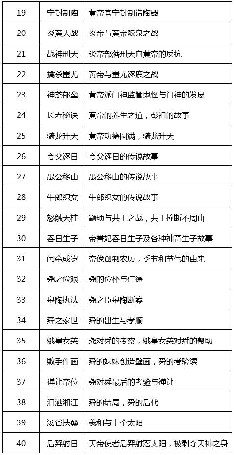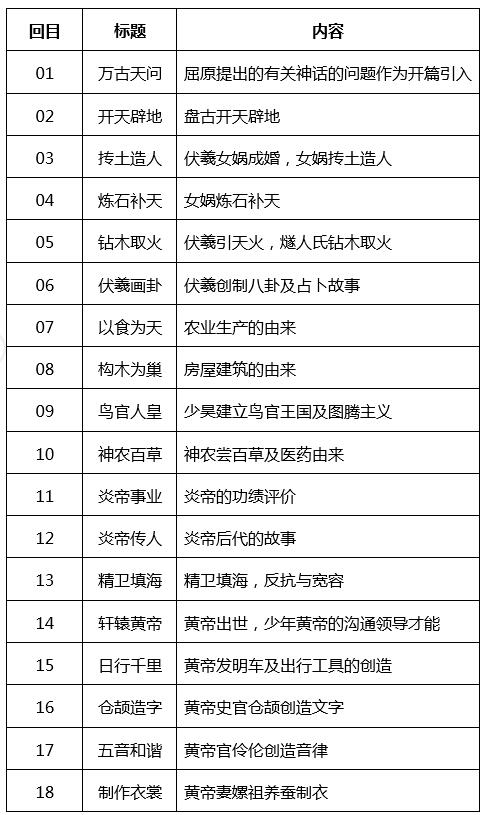 神话故事具有独特的教学价值和语文趣味,《中华创世神话-电视书场》对中国神话进行了全面的梳理,节目共有48讲、4个篇章。以战国时期楚国诗人屈原的著名诗篇《天问》开辟路径,解答诗中发问却没能给予答案的天地万象之理,作为第一讲;以大禹治水,按照山川地理的情况重新划分九州,作为最后一讲。其中,以人类诞生、炎黄战蚩尤、夸父逐日、禅让帝位等著名神话故事作为重要节点,将支离破碎、散落各地的中国神话故事回归到一个具有基本脉络、具体情节的体系中。