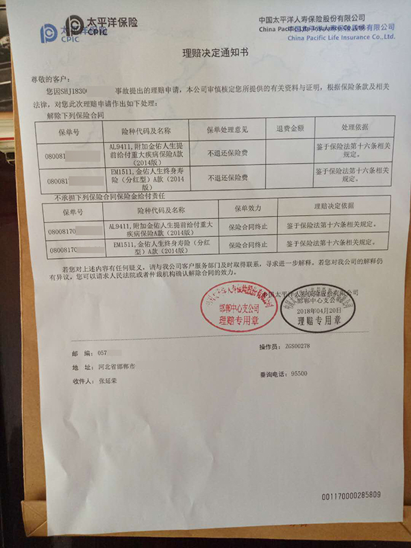 4月20日,太平洋保险针对张延荣保单出具的理财决定通知书,决定解除合同,不退还保险费。 本文图均为 澎湃新闻记者 温潇潇 图