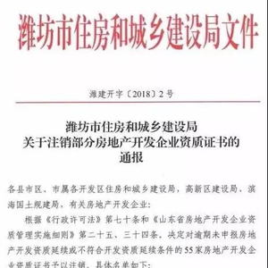 日前,潍坊市住房和城乡建设局发布《关于注销部分房地产开发企业资质证书的通报》,根据《行政许可法》第七十条和《山东省房地产开发企业资质管理实施细则》第二十五、三十四条,决定对逾期未申报房地产开发资质延续或不符合开发资质延续条件的55家房地产开发企业资质证书予以注销。