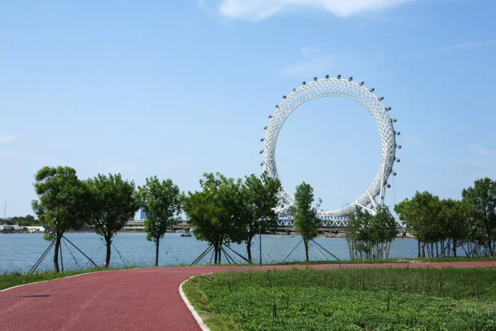 “渤海之眼”摩天轮高145米,轮盘直径125米,重量达5000余吨。它有36个悬挂式观景舱,每个可以乘坐10人,绕完一周游程为30分钟。它整体采用上层行车、下层登轮的立体设计,形成轮桥合一的独特景观。