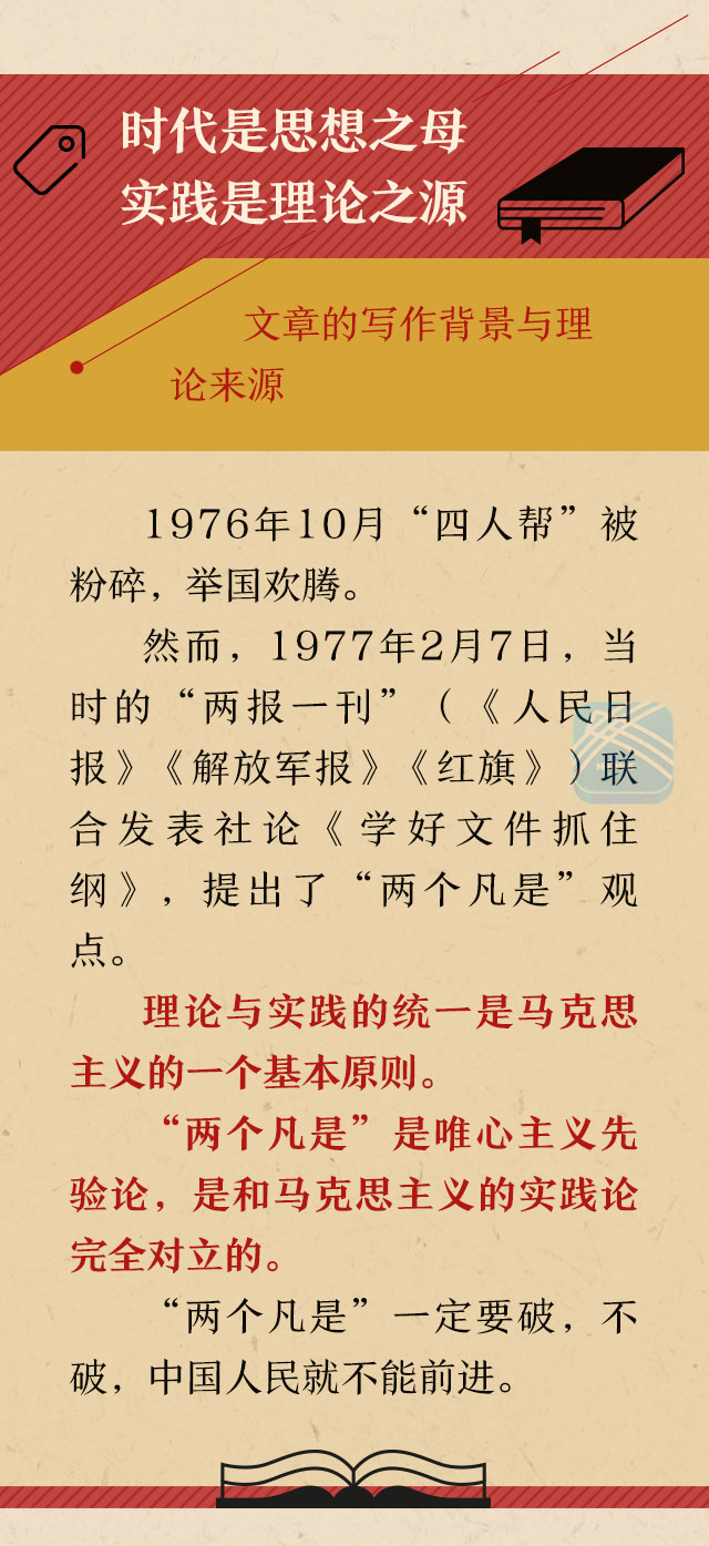 胡福明:在当时的大背景下,批判“两个凡是”错误,不能直抒胸臆,这是我面临的难题。仔细推敲、琢磨分析后我发现,“两个凡是”的根据,就是林彪鼓吹的所谓“天才论”“巅峰论”“句句是真理”等错误论断。1977年12月,我通过再阅读再学习,确定了这其实就是唯心主义的先验论。在阅读《关于费尔巴哈的提纲》第二条时,我豁然开朗找到了写作的突破口——批判唯心主义先验论,就要运用马克思主义的实践论。