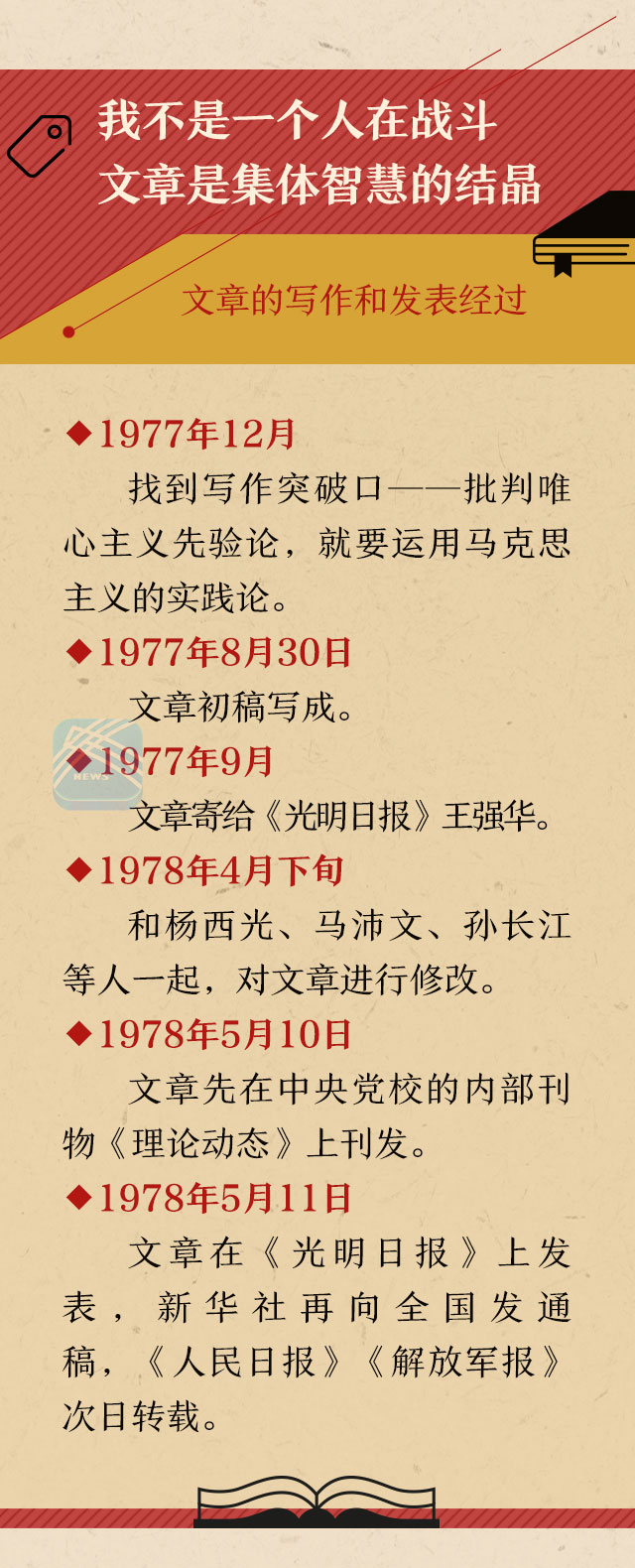 文章先在中央党校的内部刊物《理论动态》上刊发,第二天在《光明日报》上发表,新华社再向全国发通稿,《人民日报》《解放军报》次日转载。此时,我心潮澎湃,写初稿的时候,我还是一个人战斗,到了定稿发表之时,已经是一个很大的团队在工作。这篇文章是集体智慧的结晶,大家为了一个共同的目标:批判“两个凡是”,推进拨乱反正!