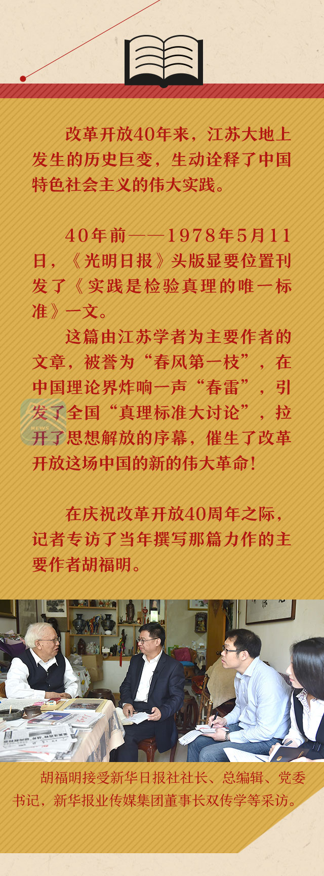 聆听历史回响,江苏人不会忘记40年前的今天——1978年5月11日,《光明日报》头版显要位置刊发了《实践是检验真理的唯一标准》一文。这篇以胡福明为主要作者的文章,被誉为“春风第一枝”,在中国理论界炸响一声“春雷”,引发了全国“真理标准大讨论”,拉开了思想解放的序幕,催生了改革开放这场中国的第二次革命!