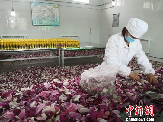 近年来,临洮县将牡丹深加工,开发出了牡丹酒、牡丹醋等一系列产品。图为酒厂工人正在挑拣牡丹花瓣。 杜萍 摄