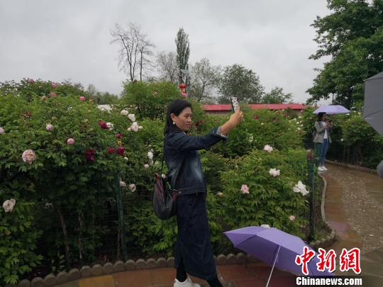 当日,临洮县迎来了入夏的首场降雨,地处县城郊区山上的车刘家村曹家坪牡丹园细雨霏霏,花开正艳。图为游人在牡丹花前自拍。 杜萍 摄