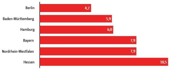 另外,年轻与活力也是柏林众多游戏企业的另一大特点。与黑森、北威和拜仁等其他联邦州相比,柏林的游戏企业的平均成立时间仅为4.2年(见图3)。而这些年轻企业的成长速度却很惊人:据估算,柏林一家游戏公司从成立到年营业额达到100万欧元平均所需要的时间仅为6年。
