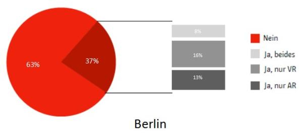 另外,柏林开始将文化创意产业与科技相结合,打造跨界融合的游戏产业。近年来,3D可视化、VR、AR等其他行业的技术成果越来越多地被应用于游戏产业。德国游戏企业在可视化领域的技术应用程度很高,据2016年统计,有23%的游戏企业在产品中运用了VR或AR技术,位列世界前列(见图8)。而在柏林,这一比例高达37%(见图9)。