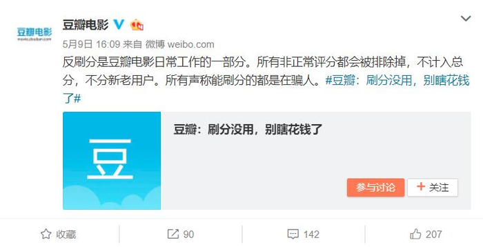 针对新片上映时5500元包刷6分的消息,豆瓣在昨日(5月9日)16点09分通过新浪微博 @豆瓣电影 进行了回应:反刷分是豆瓣电影日常工作的一部分。所有非正常评分都会被排除掉,不计入总分,不分新老用户。所有声称刷分的都是在骗人。