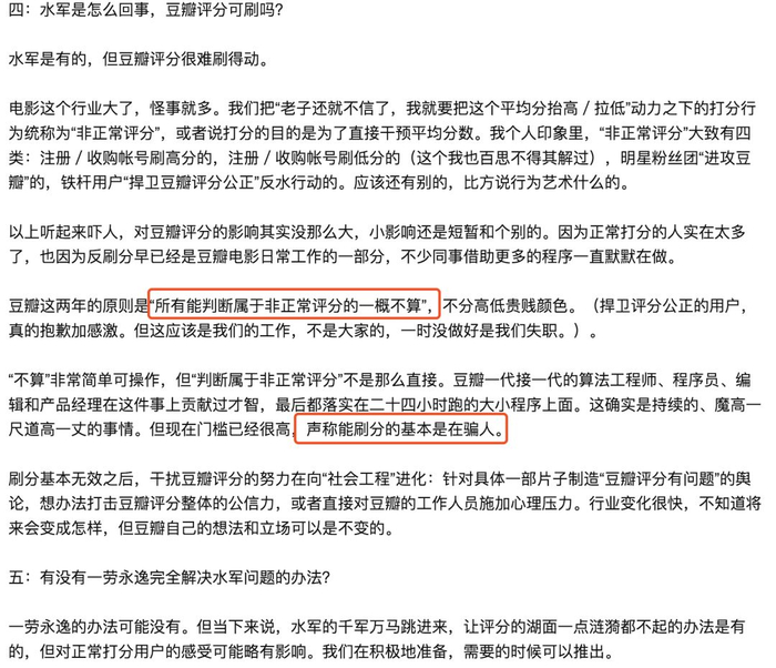 小编注意到,该文章第四问和第五问已经对刷分和水军行为表达了自己的态度:“所有能判断属于非正常评分的一概不算,能刷分的基本都是骗人的。”“解决水军问题可能没有一劳永逸的办法,但在积极准备,需要的时候可以推出。”