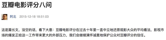 豆瓣方面在接受证券日报记者采访时表示,反非正常评分策略会根据刷分行为的变化而变化,但目前具体的规则并不方便透露。“2015年豆瓣CEO阿北在《豆瓣电影评分八问》中的回答,现在仍然适用。”