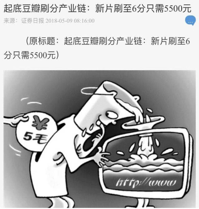 相信很多影迷、观众、电影爱好者会把豆瓣电影的评分,作为自己选择观影的“标准参考系”,尤其是在选择观看最新影片的时候,豆瓣评分显得很重要。但就在昨日(5月9日),证券日报的一篇题为《起底豆瓣刷分产业链:新片刷至6分只需5500元》的文章,让网友们炸了锅↓