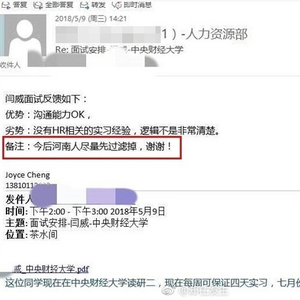 @国是直通车 5月11日消息,日前,爱奇艺某员工回复“面试邀约”的邮件截图流出,引发网友热议。邮件显示,该员工在面试中央财经大学研二学生后,备注称“今后河南人尽量先过滤掉”。