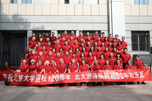 5月4日,北京大学游泳队“跨半世纪游泳欢乐颂”专场活动在北京大学邱德拔体育馆举行。这是北大游泳队自1955年成立以来,年级跨度最大(1956-2017级)、人数最多的自发聚会。各级退现役队员、教练员和家属代表近80人从世界各地回到燕园泳池,共聚一堂,其中60岁以上30多人,70岁以上10余人。年龄最长的是80岁高龄、1956级队友赵汝光女士。两位坐在轮椅上参加活动的队友说:“坐着轮椅也要来!要为大家助威!”