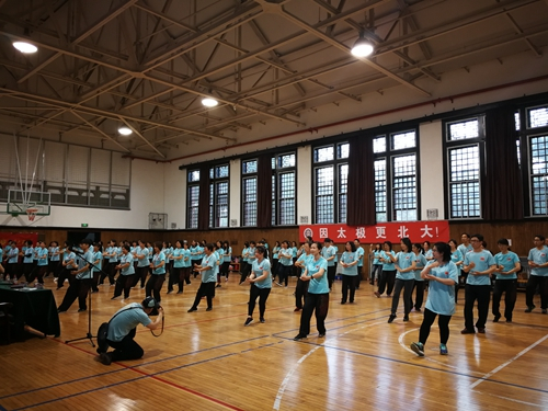 活动现场当天,阳光明媚、蓝天清澈、白云朵朵,悠扬的音乐配合着北大师生舒展的肢体动作,绿意盎然的五四操场宁静、祥和。