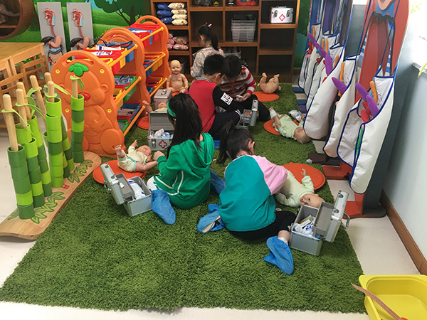 小班孩子们在为洋娃娃包扎伤口游戏中学习对自己的生命保护。