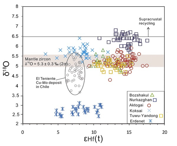 图3 中亚成矿域大型斑岩铜矿成矿岩石锆石δ18O-εHf(t)图解