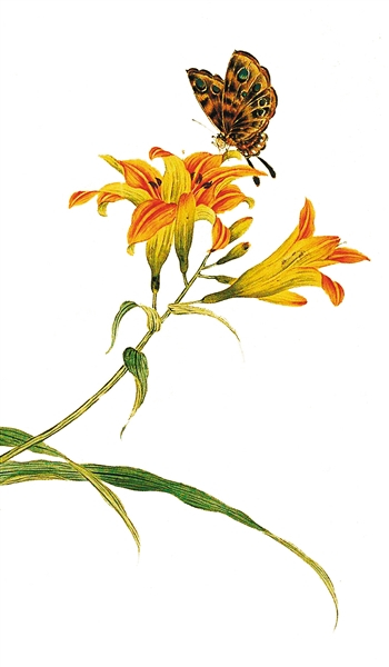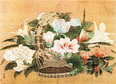 野生萱花往往是早上开放、晚上凋谢,寿命极短。宋人时常采摘萱花用作插花,但若想在短时间内画出萱花娇艳欲滴的姿态,就十分考验画家的功力。台北故宫博物院藏有宋代画家李嵩的一幅《花篮图》,该图为绢本设色,纵26.1厘米,横26.3厘米。这幅画为工笔写实风格,描绘的竹篮编织精巧,里面放满了各色鲜花,有秋葵、栀子、广玉兰、石榴、萱花等,其中萱花虽不在画面正中,但依然醒目。这两朵萱花一粉一黄,从花丛中探出,花冠高高扬起,仿佛仍在生长,说明是刚刚采摘的。小小的花篮折射出大自然的美丽、多样、蓬勃与朝气,让人观后感到十分亲切,画家对自然、生命的热爱和关注亦展现于绢上。《花篮图》画幅虽不大,但是描绘细腻具体,线条富有表现力,敷色艳丽雅致,构图稳定饱满,为宋代绘画杰作。