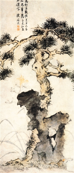 萱花是古人献给母亲的花朵,也可用于贺寿。古代画家将萱花与松石一同呈现,那么为女性祝寿的意图就十分明显了。明代画家陈淳所作《松石萱花图》现藏于南京博物院,该画为纸本设色,纵153.2厘米,横67.5厘米。画面描绘的是松树、湖石和萱花,构图饱满,松树用笔苍劲,湖石皴染结合。画中萱花作为远景,为淡黄色花朵,一朵盛开,其他含苞,整株十分高大。画家勾写兼用,画法丰富多变,显示出精湛的笔墨功夫。松树一株、湖石一丛、萱花一茎,三者结合,浓淡相宜。松树挺立,枝虬针疏;萱花掩映,光华竞发;奇石墨色淡雅,风格疏爽,画家淡墨欹毫、疏斜历乱的表现技法令人印象深刻。