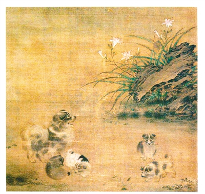 在南宋绘画上,整株萱草花常与大小狗同时出现,借以表现母狗对小狗的关爱,进而引申到人间至爱。南宋宫廷画师毛益有一幅传世之作《萱草游狗图》,现藏于日本大和文华馆。该画为绢本设色,纵横皆25厘米,作者以精细的笔法画出奇石、萱草和几只玩耍的狗。画中的远景为几株掩于奇石之后的萱草花,其花瓣内侧红白相间,有的已经盛开,有的则含苞待放。画中前景为一组犬只,一只大狗扬尾张嘴,旁边的两只小狗嬉戏着;另一组里一只欲扑昆虫的小狗呈现出神态机敏的样子。画中动物的安排,既有迎让又有疏密,且各具情态,表现出作者对生活细腻的观察。 (宗合)