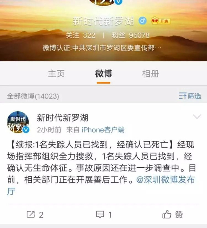 13日18时16分左右,罗湖区委宣传部及深圳微博发布厅发布消息称,经现场指挥部组织全力搜救,1名失踪人员已找到,经确认无生命体征。事故原因还在进一步调查中。目前,相关部门正在开展善后工作。
