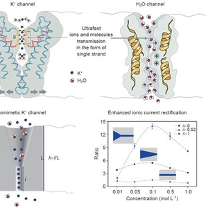 生物离子通道在物质转移、能量转换和信号传输等多种生理过程中起着重要作用。信号可以基于生物离子通道在视觉、嗅觉、听觉和触觉等过程中经神经传递到大脑。这些功能高度依赖于具有选择性的生物离子通道的高速离子传输(每个通道每秒107个离子)。这种超快物质传输源于离子通道的特殊性质,例如,小尺寸、独特的结构和表面电荷分布等,从而导致离子和分子以单链形式进行超快传输。从经典热力学角度看,具有化学选择性的纳米通道的物质传输应该是非常缓慢的。然而,在生命体系中,离子和分子的快速传输表现出量子化的超快流体状态。例如,NaK通道每次只能容纳一个水合Na+离子;K通道含有两个相距约7.5埃的K+离子,中间有一个水分子;每个Ca离子通道也同时结合两个Ca2+离子。