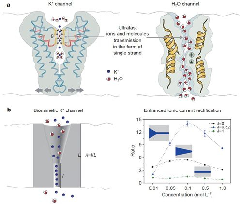 图1 生物离子通道和人工离子通道均存在超快离子和水传输
