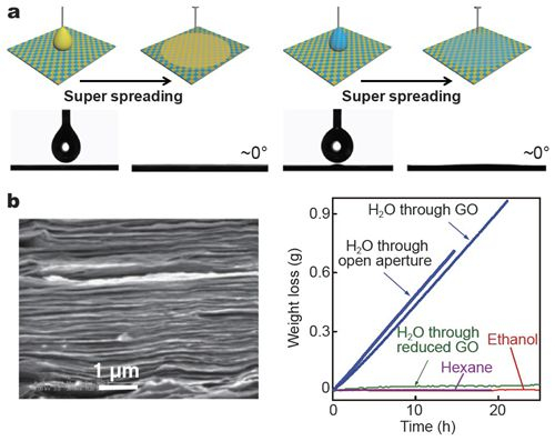 图3 二维表面液体的超铺展和二维界面的超快水传输
