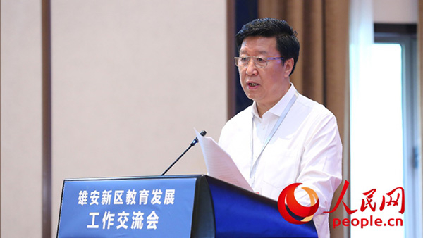 主题发言环节,北京外国语大学党委书记兼教育部教师工作司司长王定华提出12个发展理念:优先发展,把教育工作摆在优先发展的地位,优先谋划、优先投入、优先促进、优先安排、优先督察;继承发展,继承雄安三县人民重视教育和红色教育的优良传统;高位化发展,高端定位、高端谋划,对新建的园区,新建的学校要高起点、高标准、高质量、高要求;协同发展,充分调动京津冀和全国的优质资源,支持雄安的教育发展;协调发展,促进雄安基础教育、职业教育、高等教育协调发展;品质发展,推动学校品质提升,打造高品质学校;内涵发展,改进教学过程,更新教学手段,提高教学效率,促进学生思考、动手、力行、求真;国际发展,加强外语教学,促进国际理解,聘请更多外教,开展国际夏令营,建设国际学校,注重世界上先进思想的融通、融合、共享;生态发展,加强环境教育,建设现代学校制度,发挥教代会、职代会、家长委员会的正能量;智能发展,开展智慧教育,建设云平台,并与全国和河北省进行对接,让信息化助力新区教育的现代化;创新发展,让创新的思想不断地涌入,让新的教育流派在雄安滋生,营造教育家办学的制度环境;规范发展,坚持教育的正确政治方向,办社会主义教育。