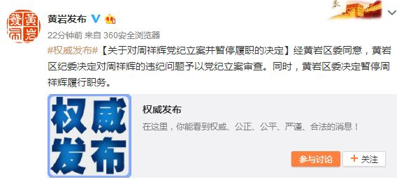 就在刚刚,台州黄岩区委又发文称,经浙江省台州市黄岩区委同意,黄岩区纪委决定对周祥辉的违纪问题予以党纪立案审查。同时,黄岩区委决定暂停周祥辉履行职务。
