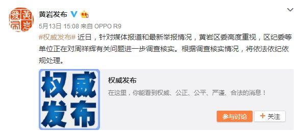 针对此事,台州黄岩区委昨日回应:针对媒体报道和最新举报情况,黄岩区委高度重视,区纪委等单位正在对周祥辉有关问题进一步调查核实。根据调查核实情况,将依法依纪依规处理。