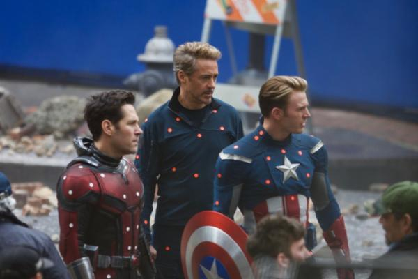 比如《复仇者联盟4》的剧照中,我们看到了还是第一部纽约大战时美国队长的装束,托尼·斯塔克衣服上还有神盾局的标志,只不过身边多了蚁人。