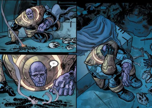 不过后来夺回力量的灭霸反杀儿子,在一百万年后杀死生命法庭、天神组、无限、吞噬者,灭亡了宇宙中所有生物,然后打算把自己献给心爱的死亡女神,但无法杀掉自己,只能求助过去时间线的灭霸把未来的自己杀掉。
